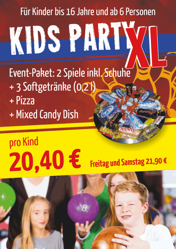 2 Spiele inkl. Schuhe, Pizza, 3 Softgetränke 0,2 l, Mixed Candy Dish, bis 16 Jahre, ab 6 Personen